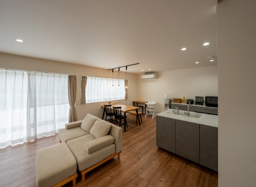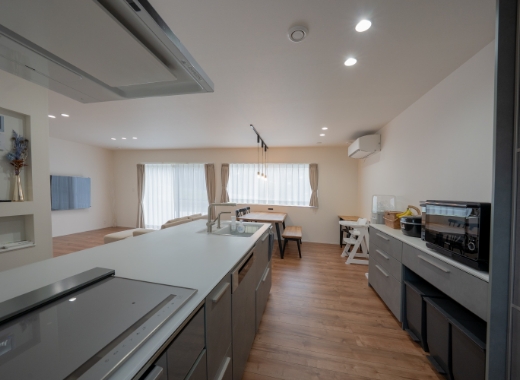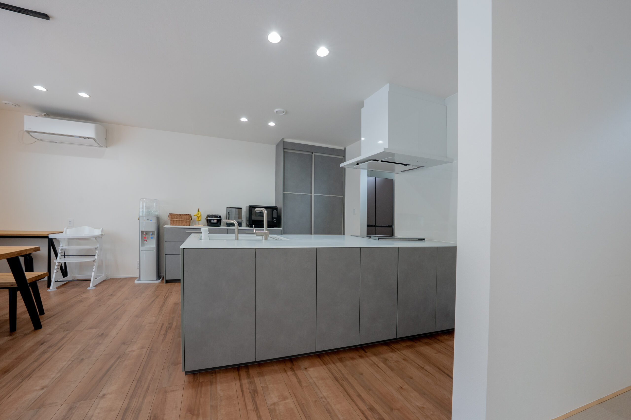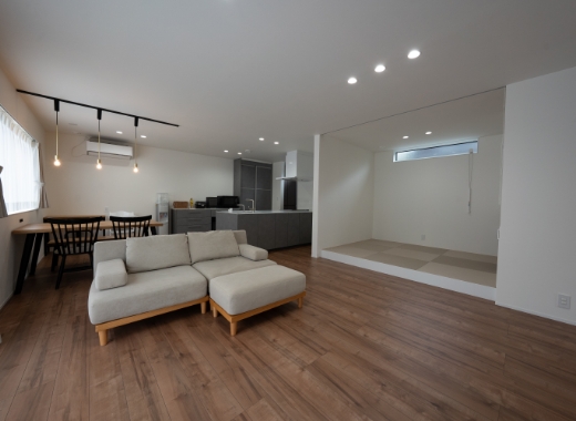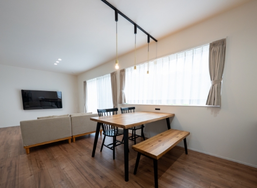 21帖の広々としたLDKには、たっぷりと陽の光を取り込む大開口窓を設けました。まるで外の景色を切り取る額縁のように、四季折々の移ろいを室内から楽しめます。