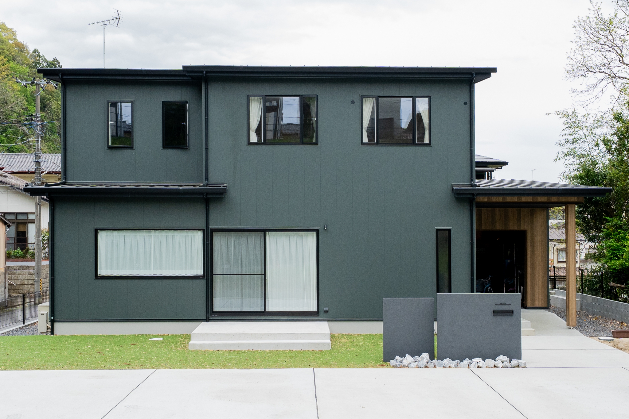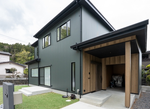グリーンの外壁がひと際目を引く外観。趣味のアウトドアやゴルフ、スノーボード用品などが収納できる玄関とつながった便利なインナーガレージが特徴のひとつです。