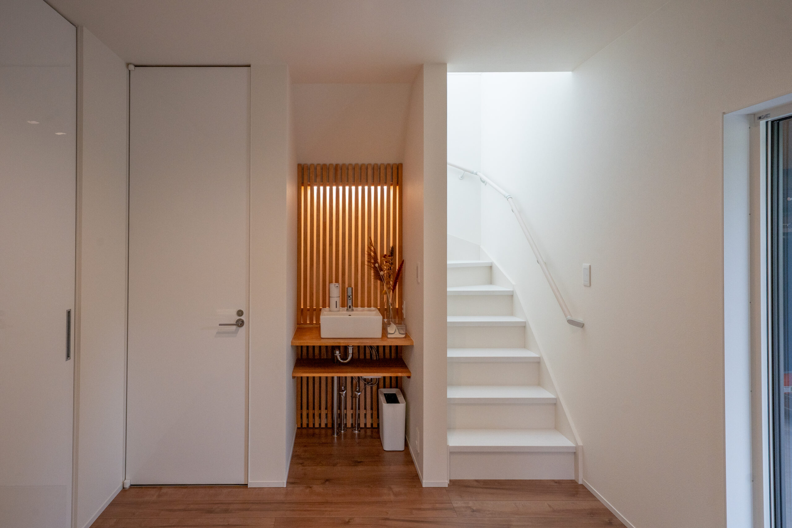 玄関には大容量のシューズクロークと収納を備え、さらに帰宅後すぐに手洗いうがいができる洗面を配置。外からのウイルスや花粉をリビングに持ち込まない、衛生面にも配慮した動線となっています。