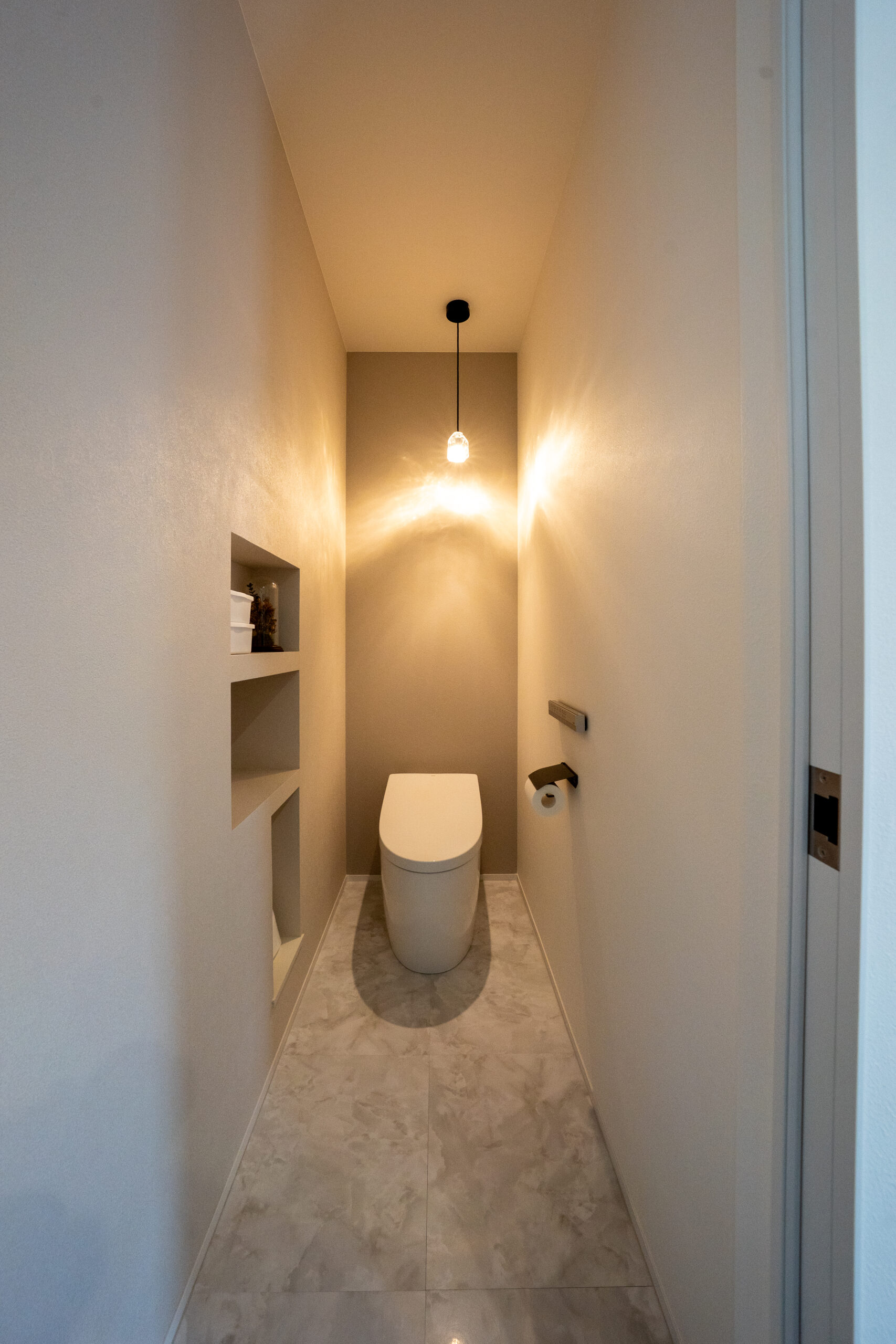 お風呂などの水回りは2階に配置し、洗面~脱衣室~お風呂までが一直線につながり、洗面室脇に設けたランドリースペースでは、腰の位置ほどのトンネルから洗濯物が移動できるユニークな仕様となっています。暮らしやすさを追求したお施主様こだわりのお住まいが完成しました。
